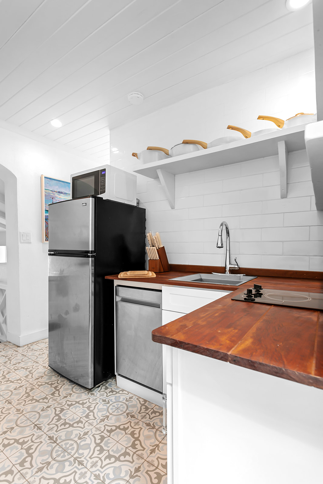 - Fully equipped kitchen with dishes, silverware, coffee maker, and refrigerator
