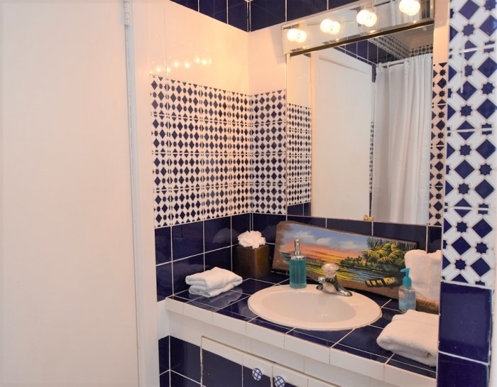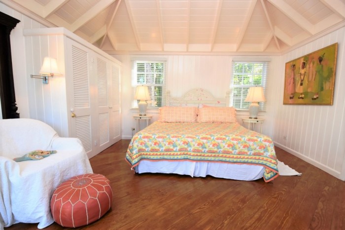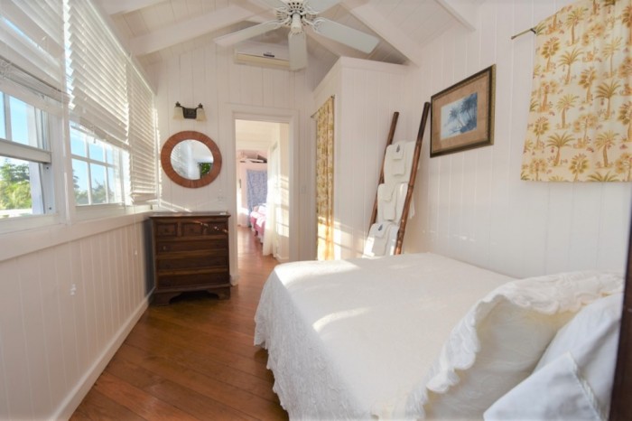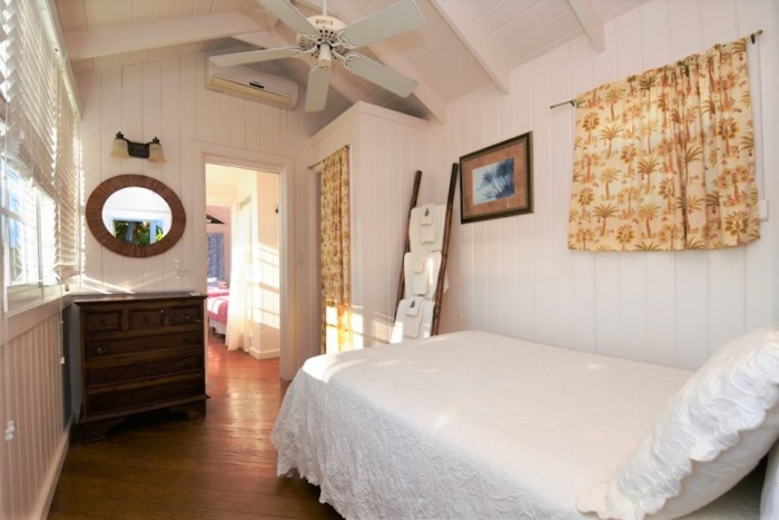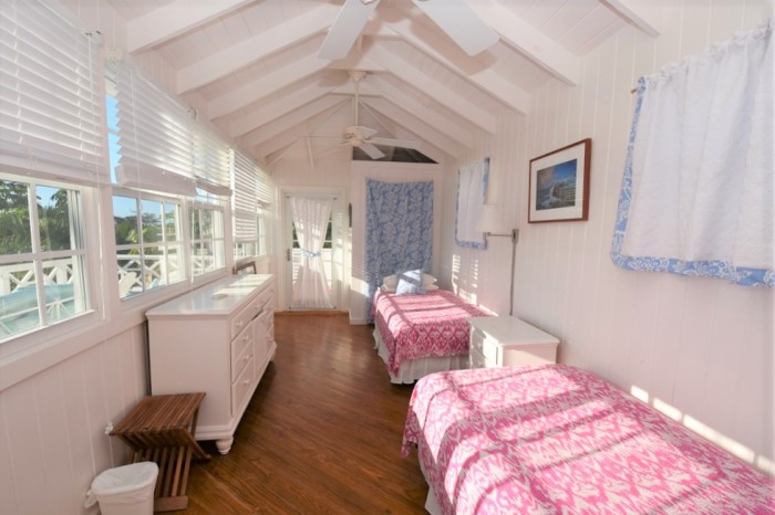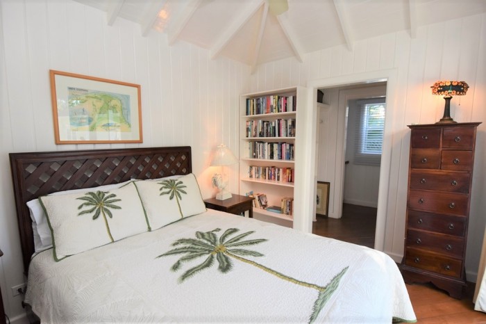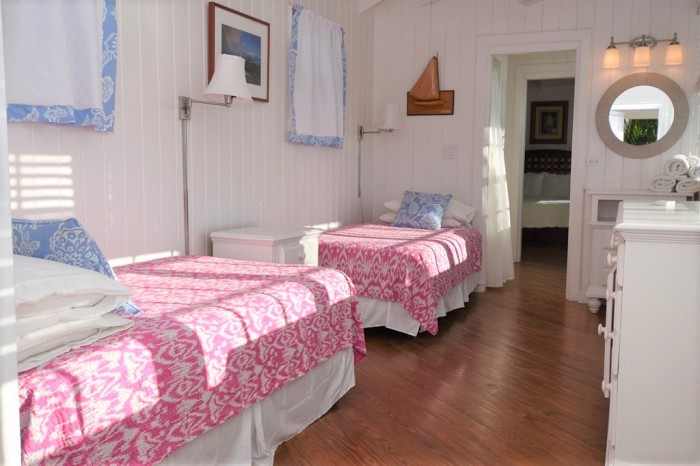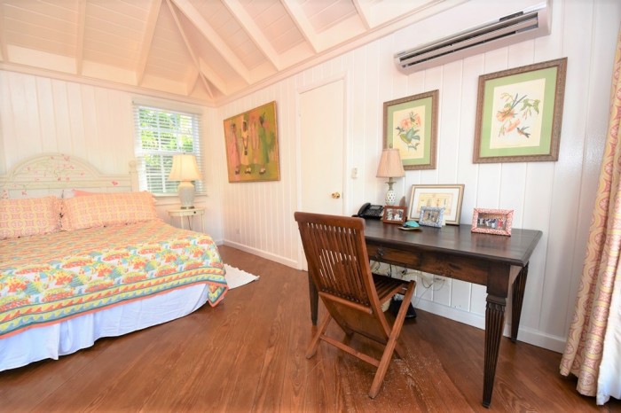 The bedroom layout provides both privacy and flexibility: two detached suites (one king, one queen) each include half baths, while the main house offers two additional upstairs bedrooms (one full, one twin – accessed from an exterior staircase) and shared facilities.