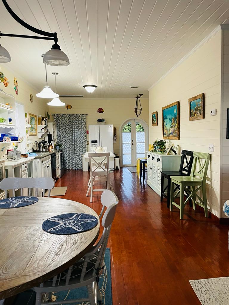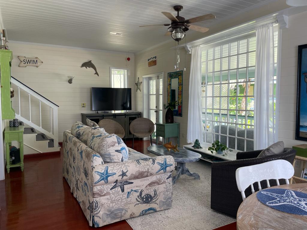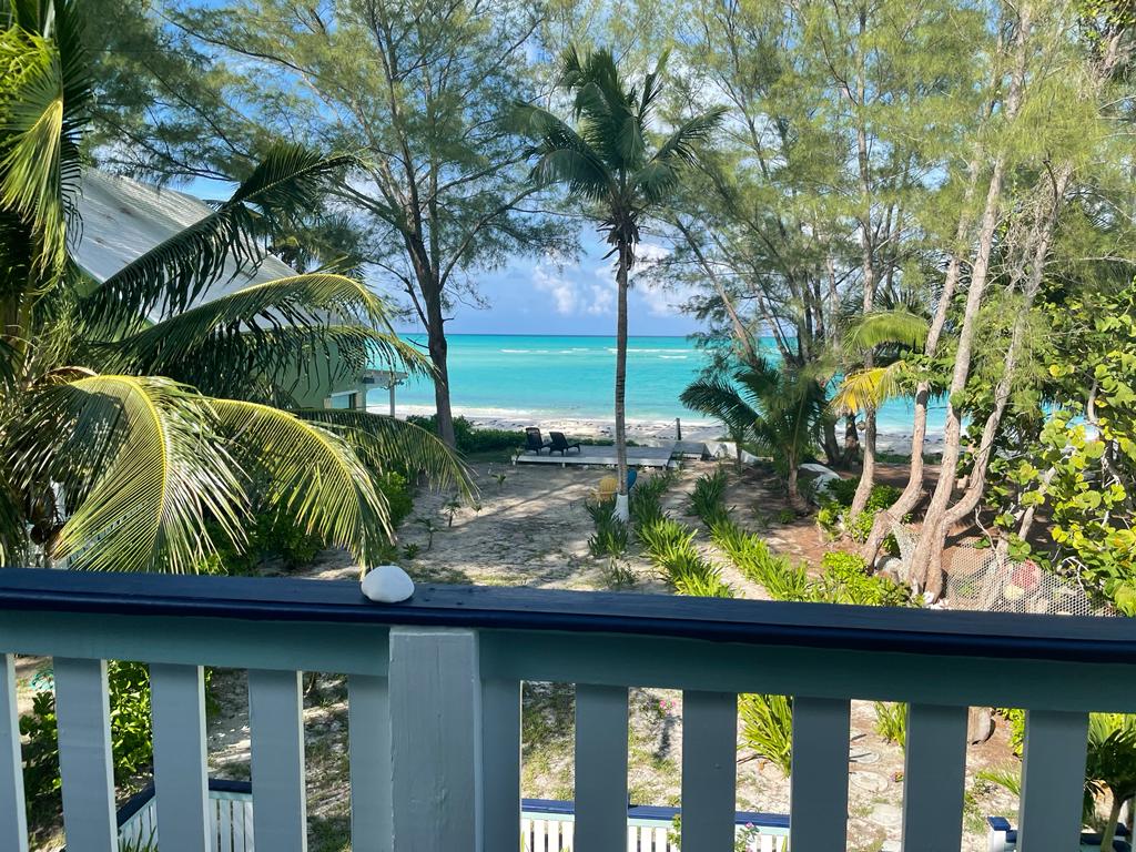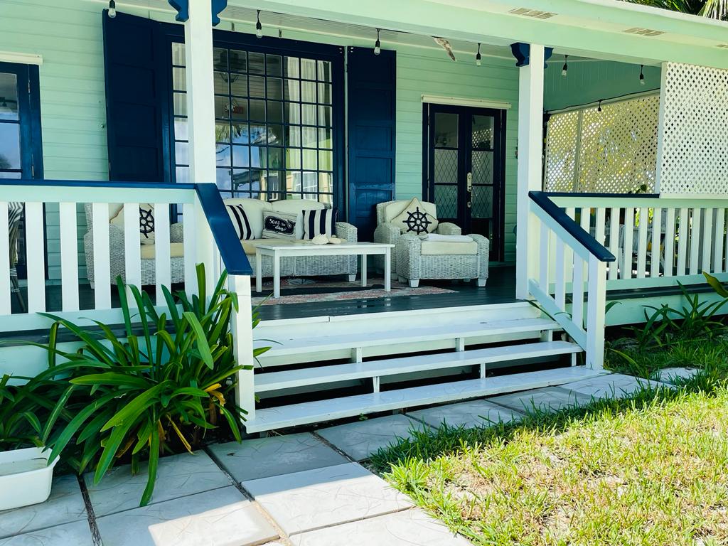 Palmetto Cottage is ideally located on the gorgeous white sand beach that stretches the northern shore of Spanish Wells, with views from the house that will take your breath away. The home offers an outdoor covered porch great for evening meals or a relaxing morning coffee. There is also an additional sunbathing deck near the shoreline where you can sit and bask in the sunshine as the kids play in the shallow waters below. Each of the home’s 3 bedrooms has its own private bathroom, two of which are upstairs and one downstairs. There’s also a 1/2 bath located near the main entrance to the house, great for visitors to use. Has fully equipped open kitchen complete with a large bar height table that seats 8 and an additional dining table that seats 4. The comfortable living area opens onto the covered ocean view porch outfitted with cozy seating and outdoor dining. The home is fully equipped with central A/C throughout, Cable TV and Wifi Internet to make your stay as convenient as possible. There is also a full laundry with washer and dryer and an outdoor shower. Come and make Palmetto Cottage your vacation getaway where dreams become reality!