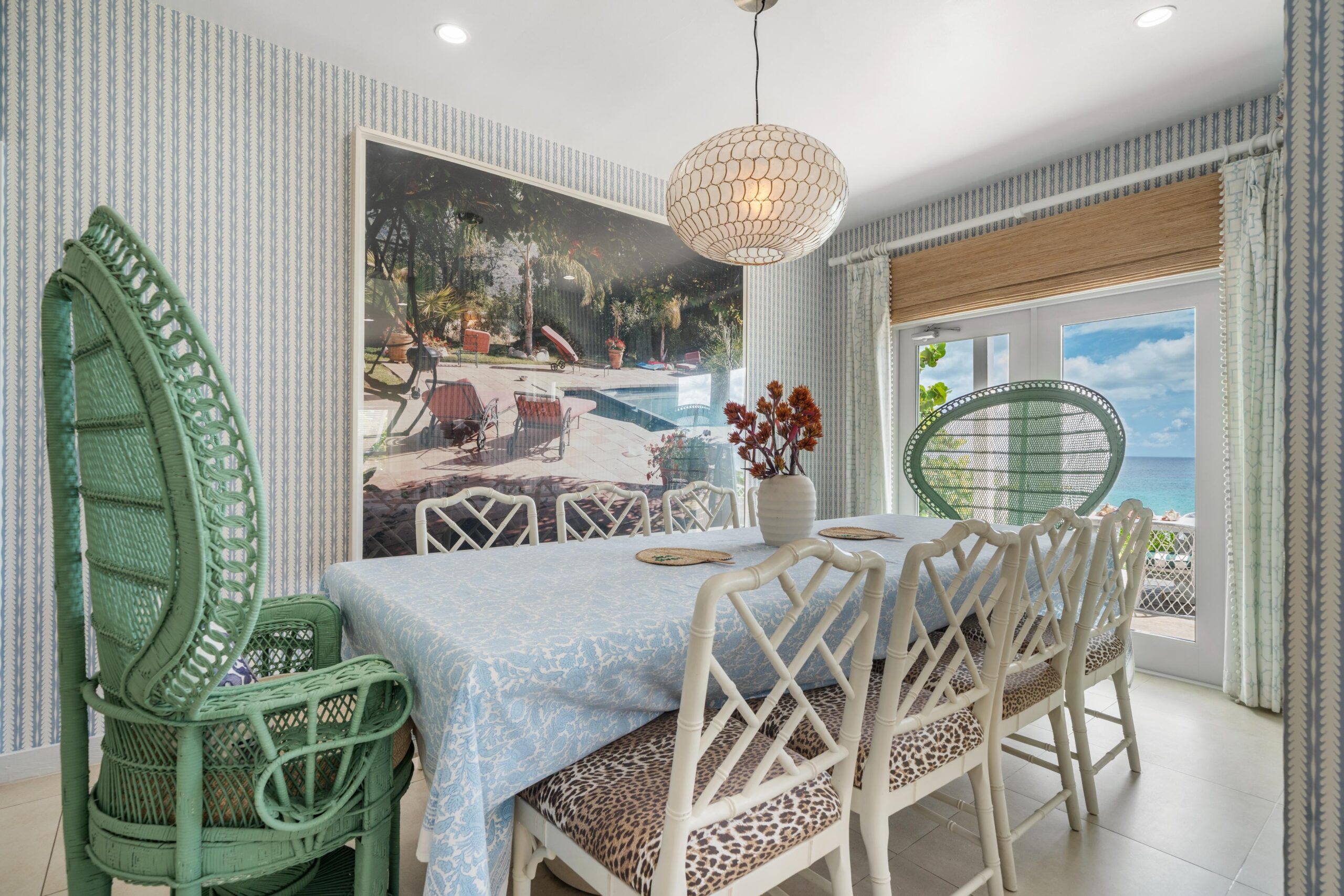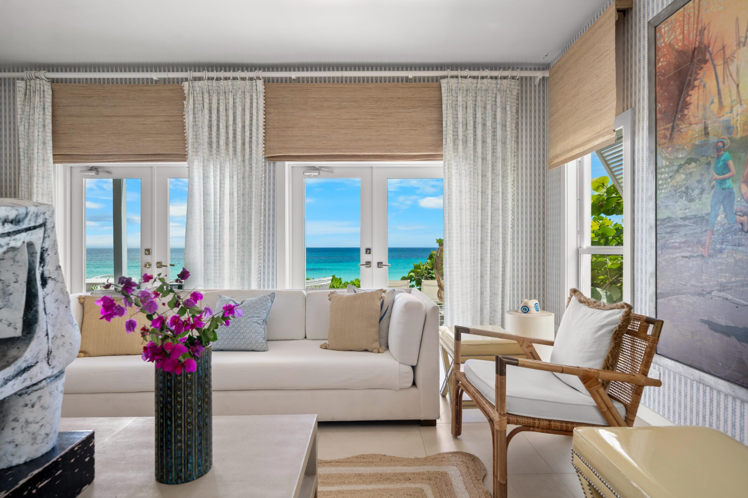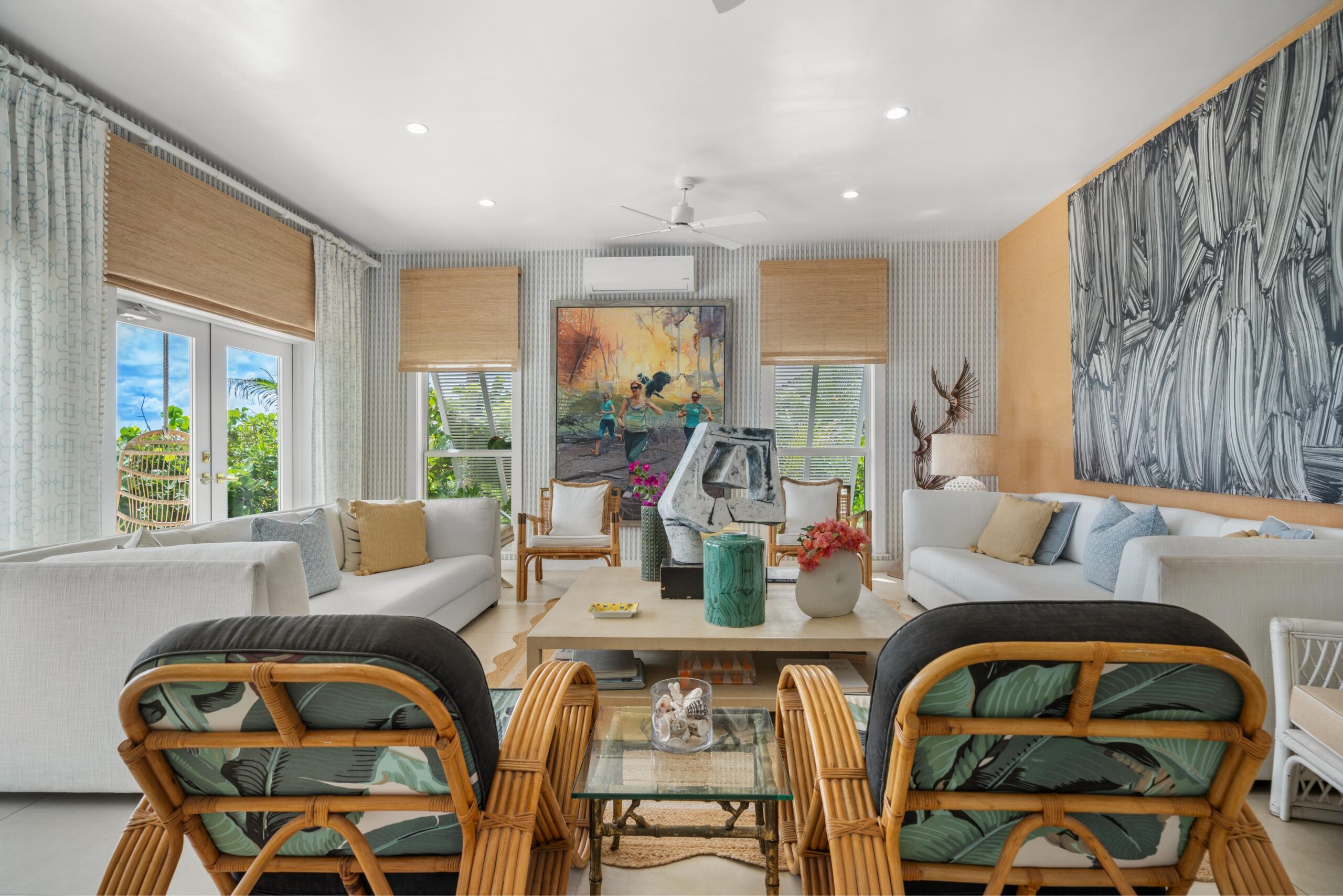 The immaculate interiors are beautifully decorated with iconic mid-century furniture featuring designers such as Karl Springer, Curtis Jere and Vladimir Kagan showcased alongside vintage rattan pieces. The walls are adorned with stunning contemporary art from the owner’s private collection.
