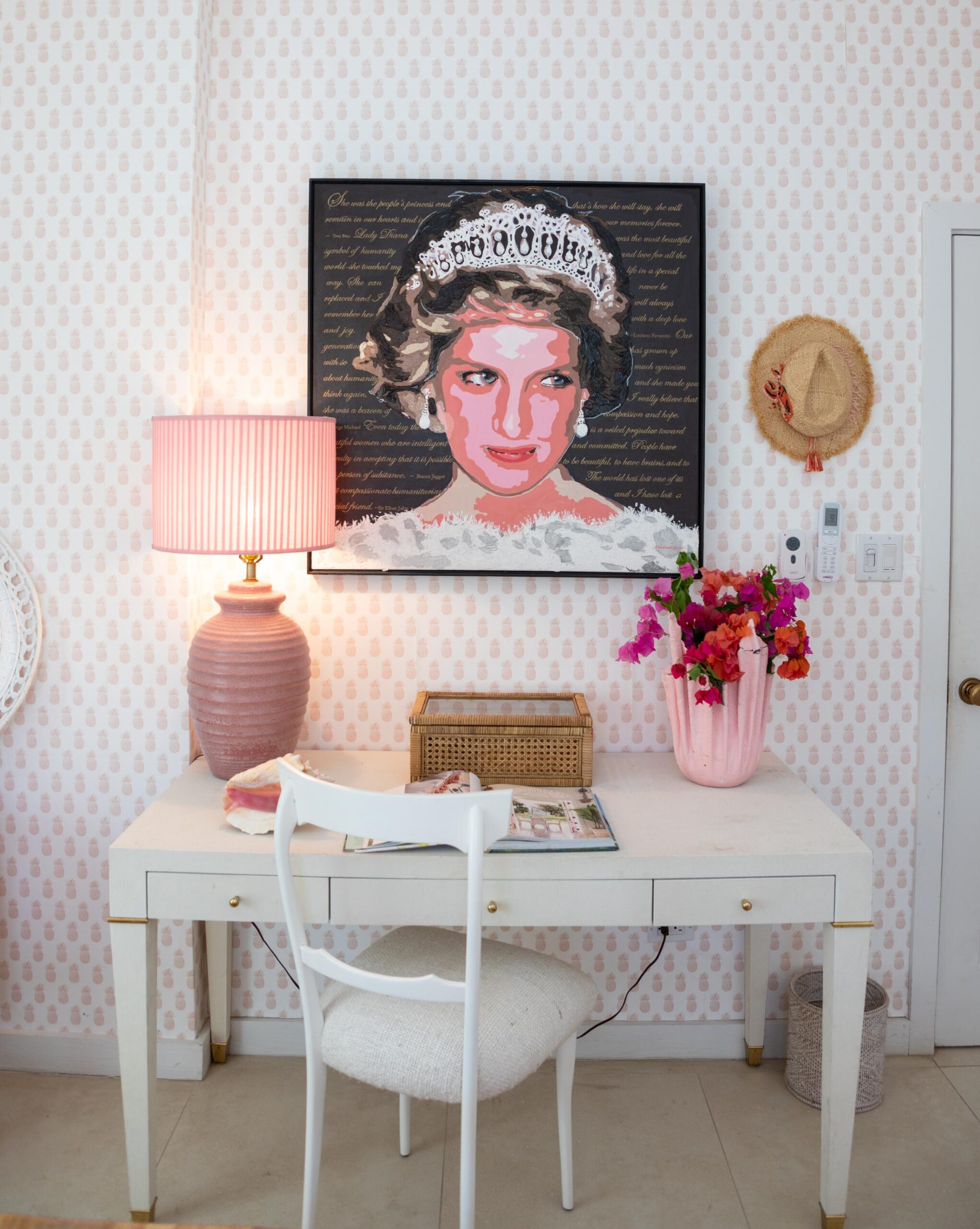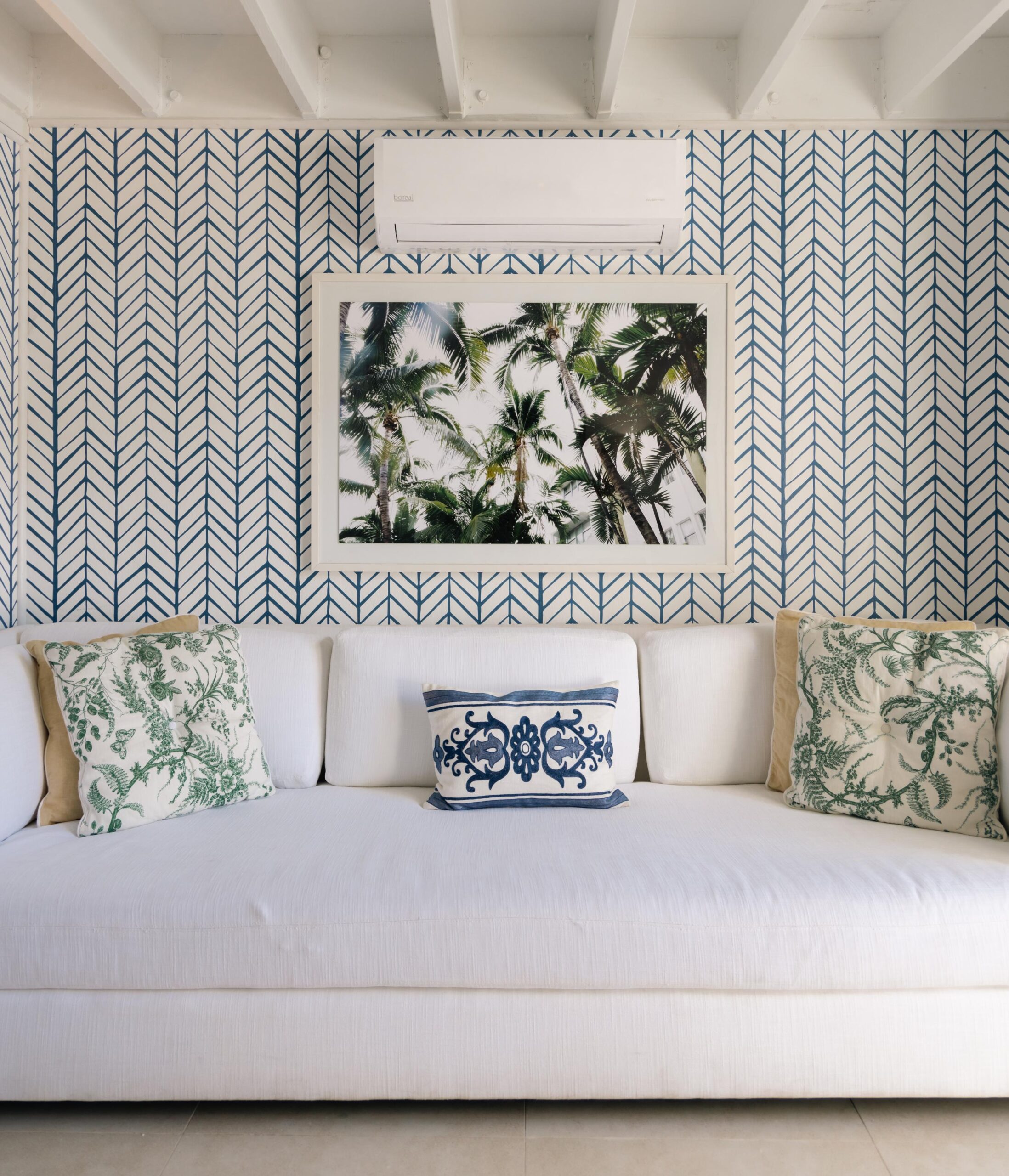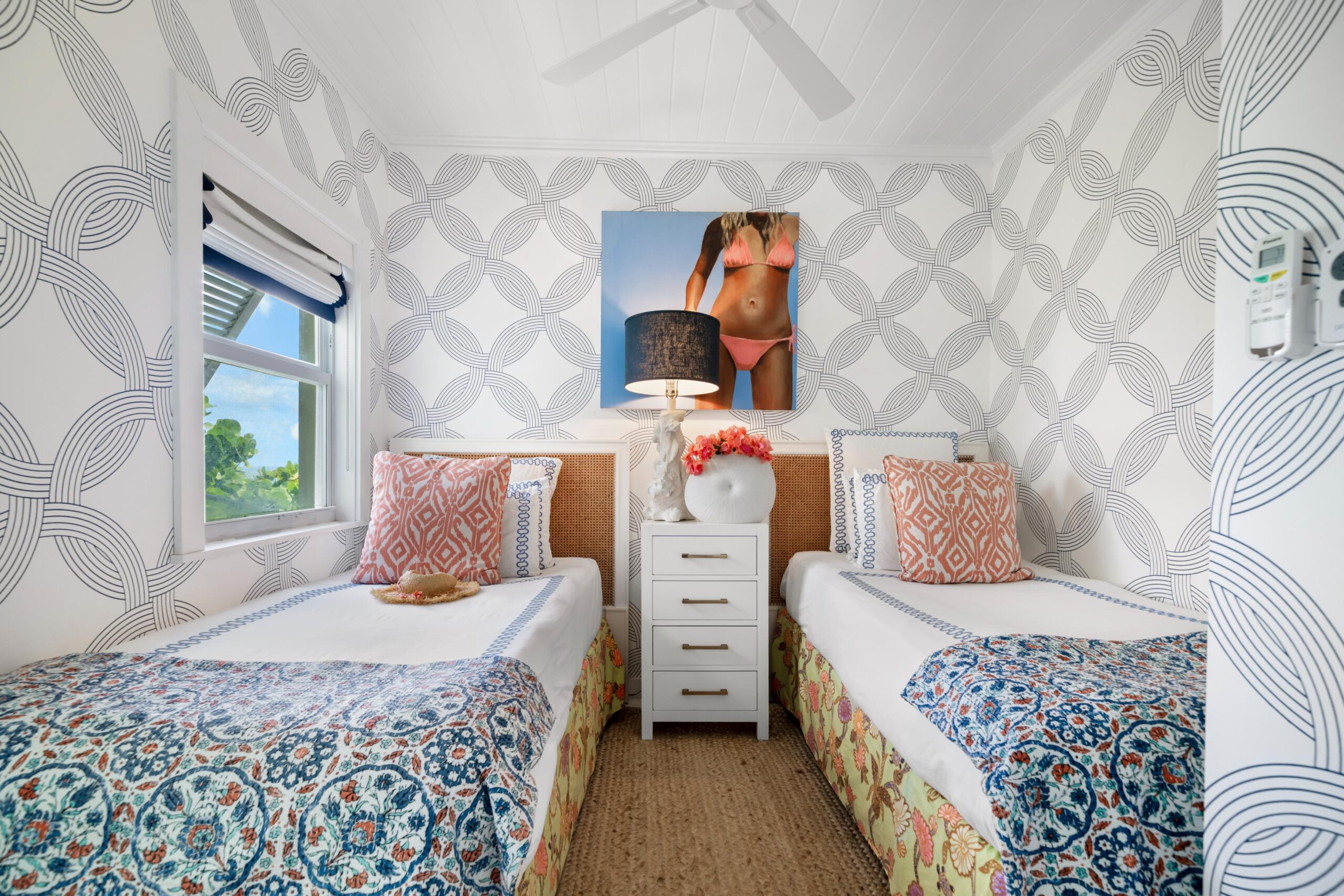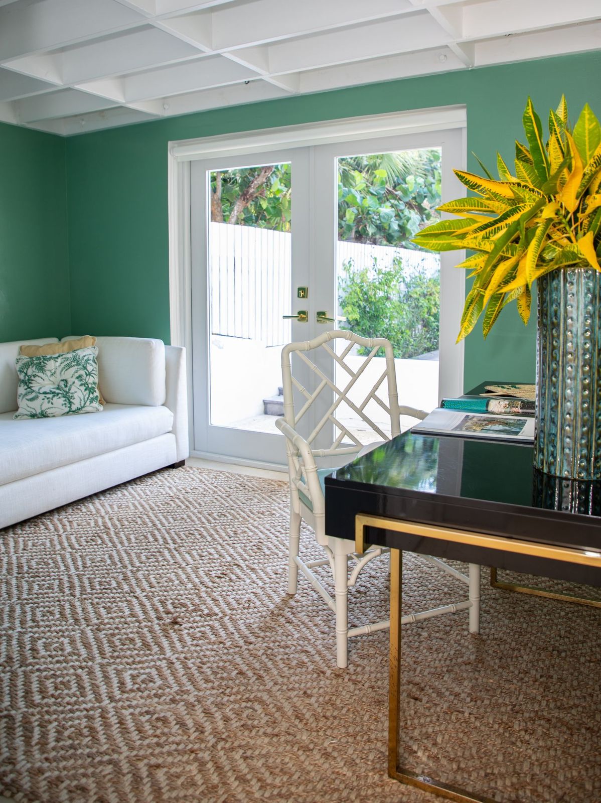 The immaculate interiors are beautifully decorated with iconic mid-century furniture featuring designers such as Karl Springer, Curtis Jere and Vladimir Kagan showcased alongside vintage rattan pieces. The walls are adorned with stunning contemporary art from the owner’s private collection.