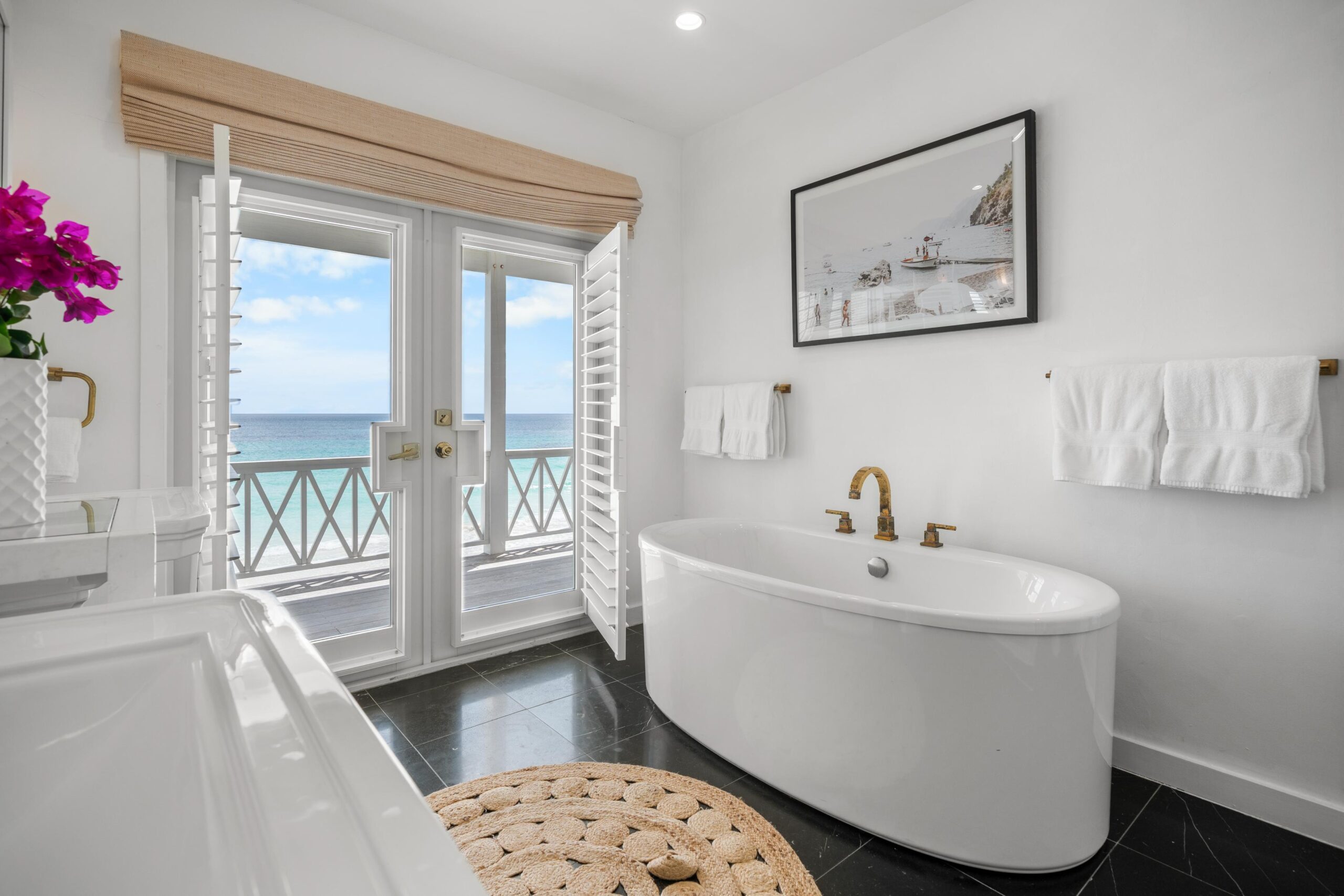 The houses each have fully equipped kitchens with new appliances and indoor, outdoor living areas which are ideal for entertaining. Every bedroom has 300 thread count linens from Serena and Lily for the perfect night’s sleep. The sleek marble bathrooms with glass enclosed showers feature lighting by Kelly Wearstler and brass bathroom fixtures by Restoration Hardware. The spectacular master bathroom has a freestanding tub overlooking the ocean.