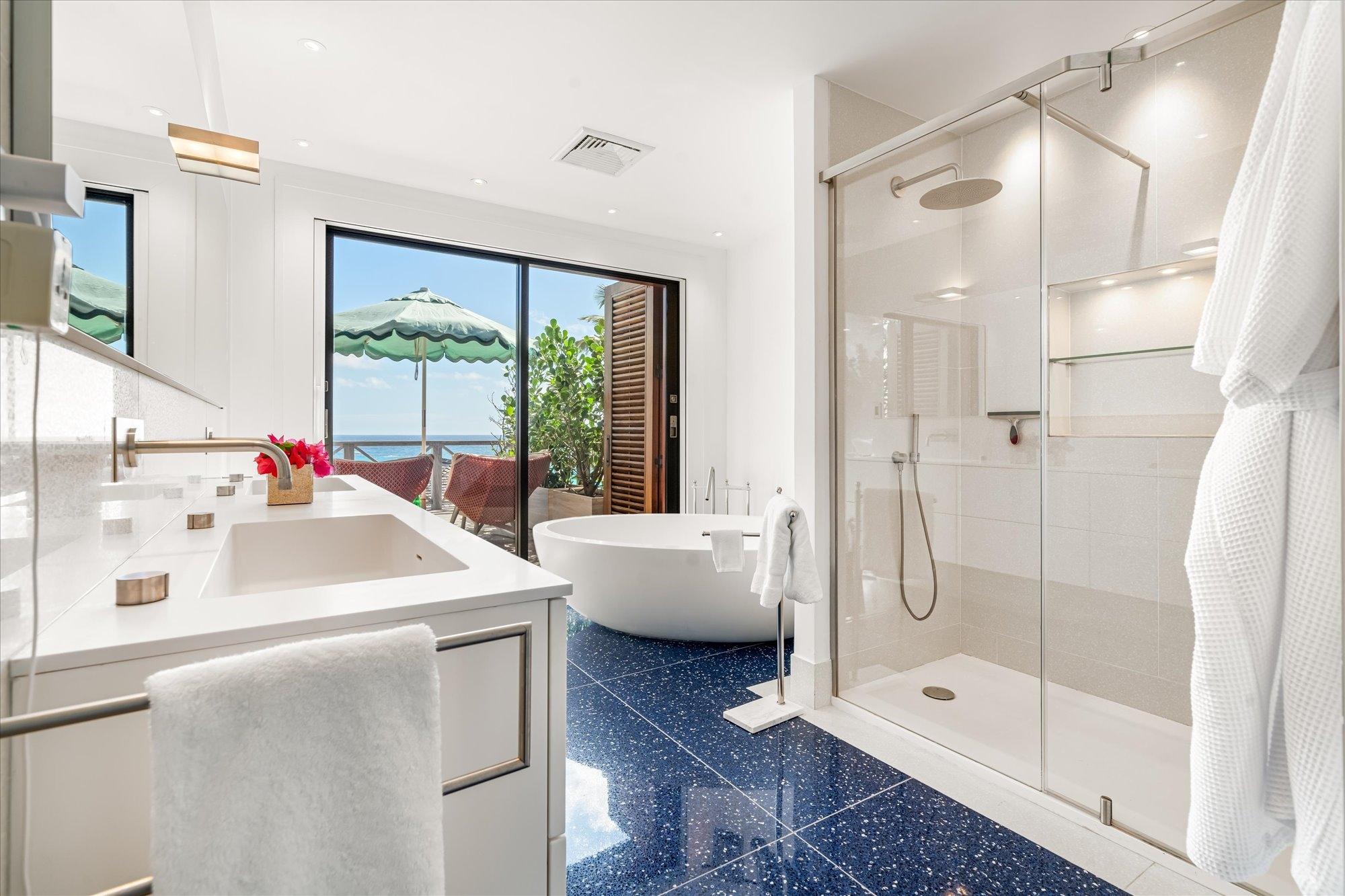 Seafair is a distinguished three-story oceanfront estate set along the world-renowned Pink Sands Beach of Harbour Island, offering approximately 100 linear feet of direct beachfront and sweeping turquoise ocean views. The property features over 5,400 sq. ft. of under-air living space and 6,275 sq. ft. of expansive outdoor decks designed for seamless indoor-outdoor living. The estate includes five ocean-view bedrooms, each with a private en-suite bathroom. An ocean-facing living and dining area showcases a beautifully appointed dining space overlooking the sea, ideal for elegant entertaining. Three gourmet kitchens are equipped with premium Wolfe and Bosch appliances, complemented by dual 180-bottle wine coolers and an additional wine refrigerator. A fully equipped home gym with bathroom offers flexibility and may be easily converted into an additional en-suite bedroom, allowing the home to function as a six-bedroom, six-and-a-half-bath residence.